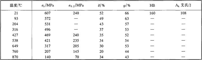 图1-38 Y1Cr18Ni9和Y1Cr18Ni9Se的低温冲击性能 (6)高温力学性能 a.高温瞬时拉伸性能 Y1Cr18Ni9和Y1Cr18Ni9Se的高温瞬时拉伸性能见表1-31和表1-32。 表1-31 退火态Y1Cr18Ni9的高温瞬时拉伸性能