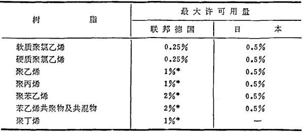 表4-4 联邦德国和日本对抗氧剂1076用于食品包装材料时的用量规定