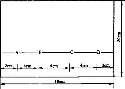 2.10 β-胡萝卜素标准使用液 将已标定的标准溶液用石油醚准确稀释后,每毫升溶液相当50μg,避光保存于冰箱中。 3.仪器 3.1 实验室常用设备。 3.2 玻璃层析缸。 3.3 分光光度计。 3.4 旋转蒸发器 具150mL球形瓶。 3.5 恒温水浴锅。 3.6 皂化回馏装置。 3.7 点样器或微量注射器。 3.8 新华滤纸 定性,快速或中速101号。 4.样品的采集和处理 4.1 粮食 样品用水洗3次,置60℃烘箱中烤干,磨粉,储于塑料瓶中,放一小包樟脑精,盖紧瓶塞保存,备用。 4.2 蔬菜与其他植物性食物 取可食部分用水冲洗3次后,用纱布吸去水滴、切碎,用匀浆器制成匀浆,贮于塑料瓶内,冰箱内保存用。 5.测定方法(以下步骤需在避光条件下进行) 5.1 样品提取。 5.1.1 取适量样品,相当于原样1~5g(含胡萝卜素约20~80μg)的匀浆。粮食样品视其含胡萝卜素量而定,置100mL带塞锥瓶中,加入丙酮20mL,石油醚5mL,振摇1min,静置5min。将提取液转入盛有100mL5%硫酸钠溶液的分液漏斗中,再于锥形瓶中加入10mL丙酮-石油醚混合液,振摇1min,将提取液并入分液漏斗中,如此提取2~3次,直至提取液无色为止。 5.1.2 植物油和高脂肪样品:需先皂化,取适量样品(<10g),加脱醛乙醇30mL,再加10mL1∶1氢氧化钾溶液,回流加热30min。然后用冰水使之冷却,皂化后样品用石油醚提取,直至提取液无色为止。 5.2 洗涤。 5.2.1 将提取液(5.1.1)静置分层,弃去下层水溶液,反复用5%硫酸钠溶液振摇洗涤,每次约15mL,直至下层水溶液清亮为止。 5.2.2 将皂化后样品提取液(5.1.2)用水洗涤至中性。 5.2.3 将5.2.1或5.2.2的石油醚提取液通过盛有10g无水硫酸钠的小漏斗,漏入球形瓶,用少量石油醚分次洗净分液漏斗和无水硫酸钠层内的着色剂,洗涤液并入球形瓶内。 5.3 浓缩与定容 将上述球形瓶内的提取液于旋转蒸发器上减压蒸发,水浴温度为30℃,蒸发至约1mL时,取下球形瓶,用氮气吹干,立即加入2.0mL石油醚定容,备层析用。 5.4 纸层析。 5.4.1 点样:在18cm×30cm滤纸下端距底边4cm处作一基线,在基线上取A、B、C、D四点(见图5-6),吸取0.10~0.40mL浓缩液(5.3)在AB和CD间迅速点样。