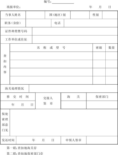 印发《〈关于禁止邮寄或非法携运国家秘密文件、资料和其他物品出境的规定〉的工作办法》的通知 各省、自治区、直辖市保密局,中央和国家机关各部委保密委员会办公室,解放军保密委员会办公室,各人民团体保密委员会办公室,广东分署、各直属海关: 现将《〈关于禁止邮寄或非法携运国家秘密文件、资料和其他物品出境的规定〉的工作办法》印发你们,请认真贯彻执行。 一九九五年三月二十日 《关于禁止邮寄或非法携运国家秘密文件、资料和其他物品出境的规定》的工作办法 第一条 为贯彻执行《关于禁止邮寄或非法携运国家秘密文件、资料和其他物品出境的规定》(以下简称《规定》),制定本工作办法。 第二条 保密工作部门或机构办理《中华人民共和国国家秘密载体出境许可证》(以下简称《许可证》)的管理权限: (一)中央、国家机关和人民团体的保密工作机构负责本部门及在京直属单位办理《许可证》的工作; (二)地市级(含)以上政府保密工作部门负责本行政区域内办理《许可证》的工作; (三)中央、国家机关和人民团体在京外的单位申办《许可证》,可由中央、国家机关和人民团体的保密工作机构负责办理,也可由所在地的地市级(含)以上政府保密工作部门办理。 第三条 负责办理《许可证》的保密工作部门或机构,应按照《规定》第五条和第八条,从严审批。 绝密级国家秘密文件、资料和其他物品不得办理《许可证》。 第四条 对批准携运出境的国家秘密文件、资料和其他物品,有关保密工作部门或机构签发《许可证》时,应做好以下工作: (一)填写《许可证》,字迹要工整、清楚,不得涂改,并按要求逐栏填写,栏尾空白处要加划“—”线,空白栏目应加划“—”符号。 (二)在《许可证》右上方的“( )鉴字”内填写本部门鉴定印章的号码;《许可证》与《许可证存根》中缝要加盖鉴定印章,印迹要清楚,位置要准确。 (三)携运出境的国家秘密文件、资料和其他物品应予包装并铅封(特大物品或不便包装的,可要求携运人进行包装,由《许可证》签发部门当场予以铅封),《许可证》用签发部门的公用信封封装,在信封上写明出境地海关名称,由携运人连同铅封的文件、资料和其他物品一并交出境地海关查验。 (四)携运出境的国家秘密文件、资料和其他物品,如需再带回境内的,办证时应同时为其开具入境证明信,以便海关识别。 第五条 使用鉴定印章、铅识章须经保密工作部门或机构的领导批准。鉴定印章、铅识章应由专人保管,如有丢失、损坏或有机构及其他变动,应立即向国家保密局报告。 第六条 海关按照《规定》第六条,对批准携运出境的国家秘密文件、资料和其他物品,凭加盖鉴定印章的《许可证》和与鉴定印章号码一致的铅识章号码验放。《许可证》由海关收存,并于次年一月十五日前,通过当地政府保密工作部门,逐级上交国家保密局。 第七条 对邮寄或非法携运国家秘密文件、资料和其他物品出境的当事人,海关可根据有关规定视情处以罚款;对情节严重,构成犯罪的,依法移送有关司法机关处理。 第八条 海关根据《规定》第九条和第十条,对查扣的国家秘密或涉嫌涉密的文件、资料和其他物品,应及时填写由国家保密局统一制发的《海关查扣邮寄或非法携运国家秘密文件、资料和其他物品移交登记表》(以下简称《登记表》)一式两联(见附件一),并通知所在地的地市级(含)以上政府保密工作部门,由该保密工作部门接收《登记表》及查扣件。 第九条 查扣地的地市级(含)以上政府保密工作部门接到海关移交的《登记表》及查扣件后,应将本部门的处理意见填写在《登记表》“保密部门处理意见”一栏内,并将第一联退查扣海关留存。同时填写由国家保密局统一制发的《查扣邮寄或非法携运国家秘密文件、资料和其他物品移送鉴定、查处通知单》(以下简称《鉴定、查处通知单》)一式三联(见附件二),并连同查扣件一起,按下列情况移送有关部门鉴定、查处: 1.对有密级标志的国家秘密文件、资料和其他物品,直接移送被查扣人所在地的地市级(含)以上政府保密工作部门,由该保密工作部门负责进行查处;如被查扣人属于中央、国家机关和人民团体的,直接移送其所在的中央、国家机关和人民团体的保密工作机构进行查处。 2.对需要进行鉴定的文件、资料和其他物品,直接移送被查扣人所在的省、自治区、直辖市的保密工作部门,由该保密工作部门按照“国家秘密及其密级具体范围的规定”进行鉴定,如需要有关中央、国家机关和人民团体鉴定的,该保密工作部门应移送有关中央、国家机关和人民团体的保密工作机构进行鉴定;如被查扣人属于中央、国家机关和人民团体的,应移送其所在的中央、国家机关和人民团体的保密工作机构进行鉴定。 3.被查扣人属于境外的,应根据其提供的情况,按本条上述办法移送鉴定、查处。 第十条 接到《鉴定、查处通知单》的有关保密工作部门或机构,应积极组织鉴定或查处工作; 对海关查扣的有密级标志和经鉴定属于国家秘密的文件、资料和其他物品,应依据有关保密法规进行查处; 对鉴定为不属于国家秘密的,应由鉴定部门在《鉴定、查处通知单》上写明鉴定意见,由被查扣人所在地的地市级(含)以上政府保密工作部门根据鉴定意见,出具非密证明,同时通知物主前来领取;被查扣人属于中
