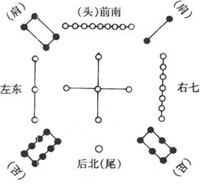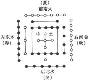 图1-5 《河图》图 天一生水,地六成之;地二生火,天七成之; 天三生木,地八成之;地四生金,天九成之; 天五生土,地十成之。 这种《河图》生数成数相合的关系,即后来天干“夫妻刚柔”相配的理论原始。针灸学中许多刺法与配穴法,以及宋金时代发展起来的子午流注按时配穴法等,也都以此为理论根据,将分别在有关篇章中讨论。 2.《洛书》与九宫数 《洛书》是根据古代对北斗星斗杓所指方位与时令变化的认识发展而来的。古代将东、南、西、北,称为“四方”(见《礼记·曲礼下》)或“四正”(见《易·乾凿度》),意指四个正位方向;将东南、西南、东北、西北,称为“四维”(见《淮南子·天文训》),或“四隅”(见《类经图翼·气数统论》),意指维系“四方”的四个偏斜方隅。“四方”加“四维”而成“八方”;“八方”并“中央”而成“九官”。《灵枢·九宫八风》中明确地指出了“九宫”与“时令”的关系(见图1-6)。结合《大戴礼记》中“明堂”分九室的规定数字:四、九、二;三、五、七;八、一、六的排列次序而成九宫数(见图1-6)。后人将其绘成图案,称为《洛书》(见图1-7),并与古代神龟负书出洛的传说结合而编成歌曰:
