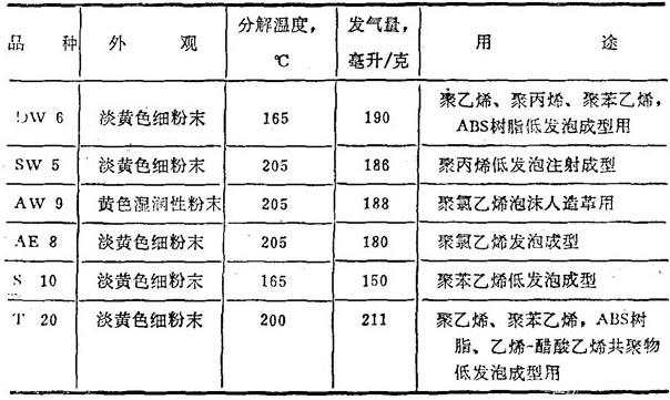 | 释义 | ビニホ一ル DW6,SW5,AW9,AE8,S10,T20 【释文】: 这六个品种是日本永和化成公司的产品,均系以偶氮二甲酰胺为主要成分的复合发泡剂,各品种的特点和用途如下: