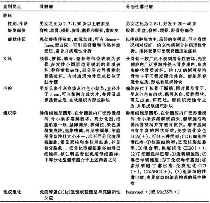 | 释义 | 一、骨髓瘤与骨其他恶性淋巴瘤的鉴别 骨髓瘤是单克隆的浆细胞恶性肿瘤,因此也称为浆细胞性骨髓瘤,瘤细胞源自骨髓腔,同时侵犯多处骨,所以又称为多发性骨髓瘤。骨其他恶性淋巴瘤较罕见,属于骨骼原发性淋巴组织恶性肿瘤,旧称骨网织细胞肉瘤。一般都是非霍奇金恶性淋巴瘤,可分为T、B及组织细胞性三大类。另外肿瘤分化程度不同,形态上多种多样。二者组织学共同特点均为圆细胞肿瘤,尤其是低分化型骨髓瘤细胞多似淋巴细胞样,核仁明显者似免疫母细胞样,因此,应仔细与骨恶性淋巴瘤鉴别(表13-16)。 表13-16 骨髓瘤与骨其他恶性淋巴瘤的鉴别要点