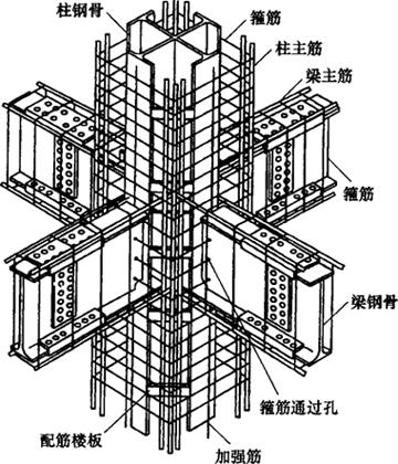 | 释义 | 一般构造要求 (一)钢骨混凝土构件 典型的钢骨混凝土(SRC)构件是梁,在H型钢等的周边配置主筋和箍筋;柱子由H型钢组合成十字形的断面,在其周也配置主筋和箍筋;梁的节点,当钢筋碰到钢骨的地方,预先在钢骨上进行钻孔,以保证钢筋能够通过。钢骨混凝土结构梁柱节点如图12-10所示。