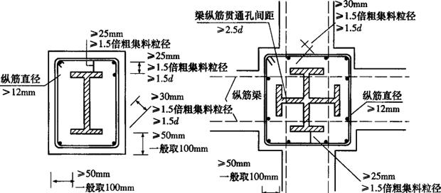 (四)钢骨混凝土构件中的纵筋配置 在钢骨混凝土构件中,纵筋的作用主要是抗弯,同时与箍筋一起形成骨架,约束外包混凝土,保证混凝土与钢骨能共同工作。纵筋的直径与配置等要求和现行国家标准《混凝土结构设计规范》基本相同。 钢骨混凝土构件中纵筋的直径d不小于12mm。纵筋的净间距,对梁不小于25mm,对柱不小于50mm,且不小于粗集料最大粒径的1.5倍及钢筋直径的1.5倍。纵筋与钢骨的净间距不得小于30mm,且不小于粗集料最大粒径的1.5倍。如图12-12所示。