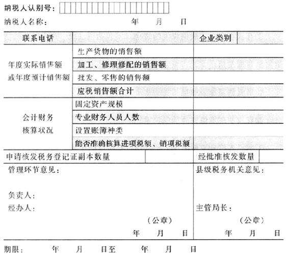 注:1.纳税人在办理开业登记时,可以按预计销售额填写,经主管税务机关审核后,暂认定为增值税一般纳税人,享有增值税一般纳税人的所有权利与义务。一个会计年度结束后纳税人根据实际经营情况,据实填写本表,交主管税务机关重新审核认定增值税一般纳税人。 2.企业类别:工业、商业。 3.本表一式两份,纳税人填报后,经税务机关审核后,一份交纳税人,一份主管税务机关留存。 4.本表为A4竖式。 |