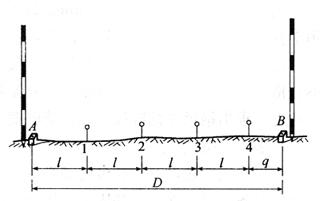 | 释义 | 一般量距方法 钢尺量距一般采用整尺法量距,根据不同地形可采用水平量距法和倾斜量距法。 1.平坦地面量距方法 在平坦地区,当量距精度要求不高时,可采用整尺法量距,直接将钢尺沿地面丈量,不加温度改正和不用标准弹簧秤施加拉力。量距前,先在待测距离的两个端点A、B用木桩(桩上钉一小钉)标志,或直接在柏油或水泥路面上钉水泥钉标志。采用边定线边量距的方法,需3人作业。步骤如下: 1)负责定线作业员站在A点标杆后面指挥定线。 2)丈量第1整尺段。后尺手持钢尺零端,前尺手拿钢尺末端,并带一根标杆及一套测钎(6根或11根),朝B点前进,走到约一整尺时竖直持标杆,在定线员的指挥下将标杆移动到AB直线上,让标杆自然落下,在标杆尖处的地面作一标志。然后,后尺手将尺的零点对准A点,前尺手使尺子通过地上所作的定线标志,前、后尺手拉紧钢尺,前尺手在尺末端处垂直插下一个测钎1点,这样量完第1整尺段。 3)丈量第2整尺段。前、后尺手同时将钢尺抬起(悬空勿在地面拖拉)前进。后尺手走到第1根测钎处,前尺手听从定线员指挥重新定点,并丈量第2整尺段得2点。 4)丈量第3整尺段。量第3尺段前,后尺手拔起1点测钎后,前、后尺手同时将钢尺抬起继续向前走,当后尺手走到2点处,前尺手按上述方法定线,前、后尺手配合完成第3整尺段的丈量。 如此丈量一直量到最后不足一整尺段为止,如图4-8所示,后尺手应对准4点,前尺手在B点标志处读取尺上刻划值。最后,总计后尺手中测钎数即为整尺段数,设不到一个整尺段的距离为余长q,则水平距离D可按下式计算: D=nl+q 式中 n——尺段数; l——钢尺长度; q——不足一整尺的余长。