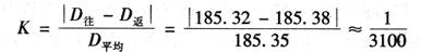 图4-8 平坦地面量距方法 为了提高量距精度,一般采用往、返丈量。返测时是从B→A,要重新定线。取往返距离的平均值为丈量结果。 量距的精度以相对误差来表示,通常化为分子为1的分子形式。例如某距离AB,往测时为185.32m,返测时为185.38m,距离的平均值为185.35m,故其相对误差K为: