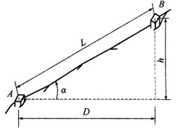图4-9 分段平量法 (2)沿地面丈量法 如图4-10所示,地面坡度较大,但较均匀时,可沿地面量出倾斜距离L,再测出两点间的高差h或地面倾斜角α,然后计算水平距离D。 D=L·cosα