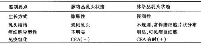 乳头状腺癌的转移与脉络丛乳头状癌有时两种结构较相似,瘤细胞同样为柱状上皮,有乳头状结构,有粘液分泌或杯状细胞出现,鉴别见表9-11。