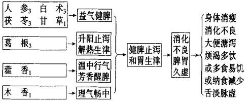 【要点】 用四君子培土治本,加葛根、藿香、木香促进脾之生升运化之机,使补而不滞。 【应用】 1.小儿消化不良。 2.胃肠型感冒。 3.糖尿病口甘者。 【注意】 1.湿热腹泻者不宜使用本方。 2.治糖尿病口甘适当加大药量。 【类方】 启脾丸(《医学入门》):由人参、炒白术、炒山楂、橘皮、泽泻、生甘草、白茯苓、山药、莲子组成。功能健脾化湿,和胃消食。主治脾虚食滞,形体虚羸,不思饮食,嗳腐酸臭,大便溏薄,苔腻或垢浊,脉濡弱。 |