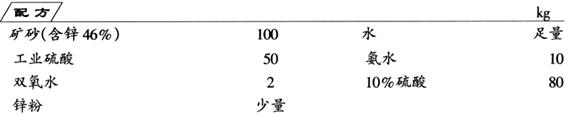 将矿砂加入200L水,在搅拌下分三次加入50L工业硫酸,搅拌1h,加水到500L。煮沸0.5h,抽滤,滤液加氨水到pH=5,滴加双氧水到无红色产生为止。抽滤沉淀用水洗三次,静置、分离、浓缩、合并第一次滤液,再用氨水调到出现的白色沉淀刚好溶解为止,pH=10。趁热抽滤,滤液蒸发回收氨,当析出大量白色沉淀时,过滤,再蒸发回收氨、过滤、合并沉淀,用水洗三次,抽滤,用10%硫酸慢慢溶解沉淀,注意别加酸过量,如过量,则用氧化锌回调到pH=5.1,或用事先留下的少量沉淀来中和。溶解完毕,加入少量锌粉煮沸、过滤、浓缩蒸发到49~52°Bé,经冷却结晶,抽滤,干燥得成品,母液再浓缩得成品,合并产品,收率应在50%~60%。