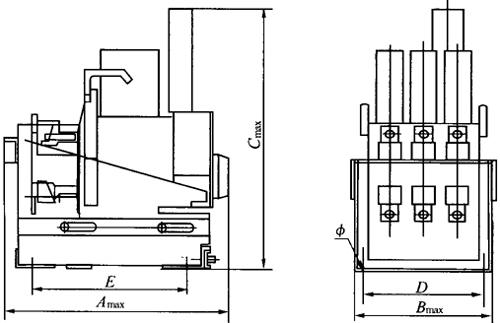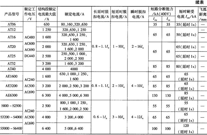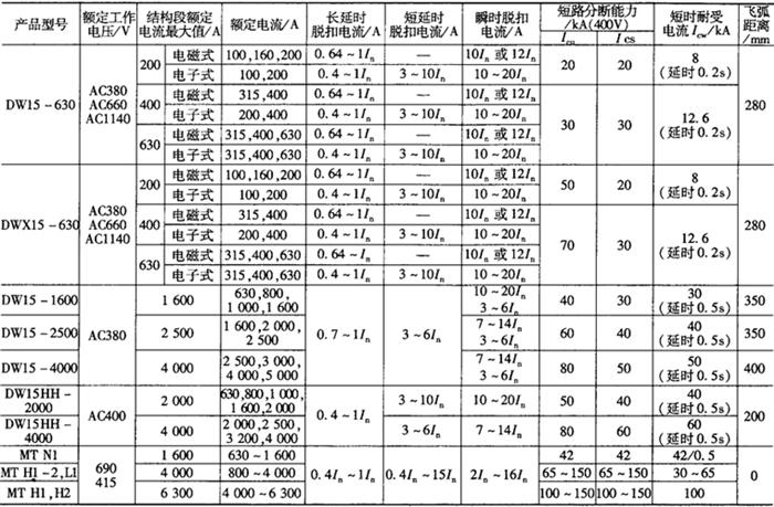 (1)M系列为法国施耐德公司产品,外形与安装尺寸基本与DW45相似,施耐德公司新推出的MT系列也分三个框架,分别为1600,4000和6300,与M系列相比,额定运行短路分断能力与额定短时耐受电流进一步提高,实现Icu=Ics=Icw;产品外形尺寸缩小,保护功能齐全;智能控制器在原保护功能基础上,增加电压、频率和功率的测量,谐波和基波的计算,精确分析电网质量,能与多种现场总线连接等。 (2)F系列为意大利ABB公司生产的产品,ABB公司新推出的EmaxE系列为5个框架尺寸13个规格,与原F系列相比,额定运行短路分断能力与额定短时耐受电流进一步提高,实现Icu=Ics=Icw;使用3种微处理器脱扣器。具有选择性、后备保护及方向性、接地故障、变压器、线路、发电机、异步电动机、电容器等多种完善的保护特性及功能。可使用Lon Works和Modbus总线进行双向通信联络。 (3)3WN6为德国西门子公司产品,取代原3WN5系列,有3极和4极,固定式和抽屉式二种,最大额定电流3200A,3WN6断路器的过电流脱扣器可用作时间分段控制,并且具有状态显示和故障原因显示。脱扣信号独立存储而不需外部电源,信号的查询也不需附加的信号装置。对于脱扣器机电参数配置的测试也包含在脱扣器中。根据用户需要,还可以提供报警功能,电流表甚至通讯模块。 西门子公司新推出的WL1~WL3系列,与公司原WN6系列相比,从2个框架增加为3个框架,智能控制器功能与测量精度均有明显提高;电流、电压测量精度从原来±3%提高±1%;功率测量精度从原来±10%提高到±3%;通信功能可以与多种现场总路线连接,配置了内部总线,区域联锁模块等。 (4)AT系列是日本寺崎公司推出的新一代产品,与原AH(北开型号DW914)系列相比,该系列产品的保护器由8位微处理控制,有检测电流有效值的电子过电流继电器(OCR),而OCR可以分成三大类:普通配电线路保护、极端反时限特性保护和发电机保护,可实现遥控通信和遥测。 (5)AE-SS为日本三菱公司90年代推出的产品,是在原AE-S(广州南洋型号DW18)基础上的二次开发,与AE-S相比,体积平均缩小30%,采用电子脱扣器,可实现智能型保护,还具有监视、显示、预报、自诊断等功能。 (6)Spectronic系列是美国GE公司推出的新一代产品,有选择型S和限流型L二种,产品保护方式为智能化通信接口,可实现遥控通信和遥测等功能。 4.常用万能式断路器外形及安装尺寸 (1)DW15系列万能式断路器外形及安装尺寸见图1-21和表1-45。
