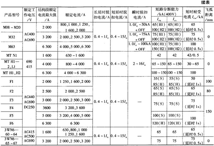 | 释义 | 万能式断路器 1.适用范围 万能式断路器适用于交流50Hz,额定工作电流至6300A,额定工作电压至690V的配电中,用来防止电能分配和电源设备的过载、欠电压、短路、单相接地等故障的危害以及保护线路。DW40、DW45、DW450等断路器具有智能化、选择性保护功能,能提高供电可靠性,避免不必要的停电。 2.常用万能式断路器的结构特征 (1)DW15-630型断路器分固定式和抽屉式两种,抽屉式由断路器本体及抽屉座组成。断路器为立体布置形式,触头系统、瞬时过电流脱扣器和左右侧板安装在一块绝缘板上。上部装有灭弧系统,操作机构可装在正前方或右侧面,有“分”、“合”指示及手动断开按钮机构指示。左上方装有分励脱扣器,背部装有欠电压脱扣器与脱扣半轴相连,速饱和电流互感器或电流电压变换器穿在下母线上,欠电压延时阻容装置、热继电器或电子型脱扣器均分别装在断路器下方。 (2)DW15-1000~4000型断路器也采用立体布置形式,由底架、侧板、横梁组成框架,每相触头系统安装在底架上,上面装灭弧室。操作机构在断路器右前方,通过主轴与触头系统相连。电动操作机构通过方轴与机构成一体装于断路器下部,作为断路器的储能或直接闭合之用,储能后的闭合由释能电磁铁承担。在左侧板上方装有防回跳机构,以防止断路器在断开时弹跳。各种过电流脱扣器按不同要求装在断路器下方,欠电压、分励脱扣器及电动操作控制部分装在左侧,其中欠电压、分励脱扣器通过脱扣器与放大机构相连,以减少断路器脱扣力。6对辅助触头供用户连接二次回路用,面板上有显示断路器工作位置的指示牌“I”、“O”和“储能”指示,还有供合闸及分闸用的按钮“I”、“O”(均按下)。DW15-1600断路器附有手动操作手柄;DW15-2500、4000断路器附有检修的手动操作手柄(均可卸下)。 (3)DW15HH断路器是DW15的二次开发产品,分固定式和抽屉式两种结构;断路器为立体布置,由侧板、横梁组成框架,每相触头系统安装在框架上,上面装灭弧室。操作机构在断路器右前方,通过主轴与触头系统相连。电动操作机构通过方轴与机构连成一体装于断路器下部,作为断路器的储能或直接闭合之用,储能后闭合由释能电磁铁完成。在左侧板上方装有防回跳机构,以防止断路器在分断时弹跳。欠电压和分励脱扣器经过放大机构与脱扣半轴相连,以减少断路器的脱扣力。面板上有显示断路器工作位置的指示牌“I”“O”及智能控制器,手动操作手柄供手动储能使用(仅指2000壳架)。抽屉式断路器由断路器本体与抽屉座组成,通过断路器本体上的母线与抽屉座上桥型触头的插座接通主回路,具有机械联锁装置,能保证断路器在断开状态下进行主回路转换。控制器由互感器组件、电子部件及执行元件等三部分组成,互感器组件由空心互感器和速饱和互感器组成,直接套在母线上,二次引出线与控制器相连。 (4)DW16万能式断路器主要由自由脱扣机构、触头系统、过电流脱扣器、灭弧系统等组成,触头系统、过电流脱扣器均装在断路器的底板上,触头系统的上面装灭弧系统,右侧装有自由脱扣机构通过主轴与触头系统相连,左侧装辅助开关。触头材料采用特种合金,有良好的抗熔焊性和低接触电阻。灭弧室栅片为平行布置,灭弧壁采用耐弧塑料制成,并配置隔弧板从而提高了断路器短路分断能力。断路器还可根据需要安装电动机、杠杆、电磁铁(只适用于630A以下壳架等级电流)等操作机构。 (5)DW17断路器是采用立体式的积木结构,分为三个壳架电流等级,即630~1605A一个壳架等级;2000~2505A一个壳架等级,3200~3205A一个壳架等级。三个壳架电流等级以630~1605A壳架为基础,其他壳架则根据不同的额定电流采用积木式结构拼装而成。断路器由框架、触头系统、灭弧系统、脱扣器、操作机构、抽屉座、触刀座及二次接线回路组成。总体结构分固定式和抽屉式两种,抽屉式附有加长导轨以利于用户的维修。接线方式有垂直进出线、水平进出线,操作方式有手动操作、电动操作和预储能操作。断路器的过电流脱扣器由瞬时脱扣器、长延时脱扣器和短延时脱扣器组成。用户可根据使用要求进行组合,实现一段、二段或三段保护。 (6)DW45智能型万能式断路器分固定式和抽屉式二种结构。其中固定式断路器主要由触头系统、智能脱扣器、手动操作机构、电动操作机构和安装板组成;抽屉式断路器主要由触头系统、智能脱扣器、手动操作机构、电动操作机构和抽屉座组成。智能型万能式断路器具有结构紧凑、体积小的特点。触头系统封闭在绝缘底板内,其每相触头也都用绝缘板隔开,形成一个个小室,而智能型脱扣器、手动操作机构、电动操作机构依次排在其前面而形成各自独立单元,如其中一个单元坏了,可将其整个拆下换上新的。其中: ①触头系统:由于采用一档触头,省去了弧触头(如有弧触头)的转移过程,减少了触头的操作力,加快了短路电流分断的过程。为了降低触头之间的电动斥力,提高触头系统的电动稳定性,触头系统采用多路并联。触头,软连接及母排之间均采用焊接,减少了接触电阻,降低了功耗。 ②灭弧室:灭弧室壁用绝缘材料压制而成,灭弧室中除装有灭弧栅外,还装有灭焰栅,使电弧向上吹入灭弧室。 ③基座:触头和灭弧系统均位于上下基座之间的空间之中。上下基座均由高强度、电气性能优良的绝缘材料压制而成。每相