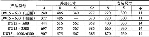 图1-21 DW15系列外形及安装尺寸示意图 表1-45 DW15系列外形及安装尺寸/mm
