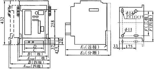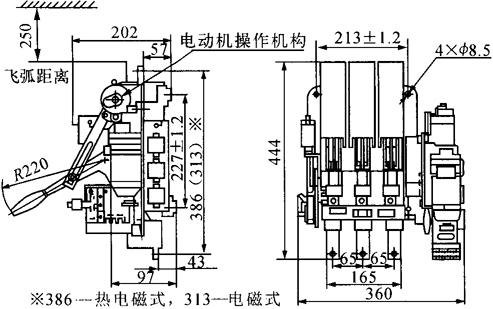 图1-22 DW16-630直接手动操作和电动机操作外形及安装尺寸 ②DW16-630杠杆操作外形及安装尺寸见图1-23。