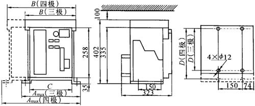 图1-26 DW16-4000外形及安装尺寸 (3)DW17系列外形及安装尺寸: ①DW17系列固定式外形及安装尺寸见图1-27和表1-46。