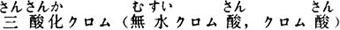 特性:红棕色晶体。易潮解。比重2.70。熔点197°,同时分解。有强烈氧化性,易于还原成绿色氧化铬(Cr2O3)。溶于水而成铬酸,溶于乙醇和乙醚。
