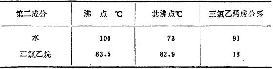 3.可与乙醚、乙醇等大多数有机液体自由混合,在25℃水中溶解度为0.11克/100克水。水在三氯乙烯中的溶解度为0.032;与水、二氯乙烷形成共沸物: