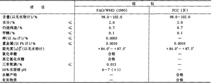 鉴别方法 1.溴化钾压片样品的红外吸收光谱与用标准三氯蔗糖同样制备者,在相同波长处显示相对最大(强度可不同)。 2.样品所得液相色谱图中主峰(排除溶剂峰)的滞留时间与标准样相似。 3.试样液薄层色谱图中主斑点的Rf值与标准样液所得相同。 毒理学依据 1.LD50 小鼠口服16g/kg(bw)。 大鼠口服10g/kg(bw)。 2.ADI 0~15mg/kg(bw)(FAO/WHO,1994)。 使用 甜味剂、增味剂。 1.使用注意事项 (1)本品为蔗糖衍生物,风味近似蔗糖,但甜度高,不被机体利用,无热值,不致龋,不与食品中其它成分相互作用。 (2)本品稳定性高,在pH2.5~3.0溶液中,于温度20℃下贮存1年,保留值大于99%;在pH4~7溶液中,于温度30℃下贮存1年,保留值大于98%。 2.使用范围及使用量 我国《食品添加剂使用卫生标准》(GB 2760-1996)规定:可用于饮料、酱菜、复合调味料、配制酒、雪糕、冰淇淋、冰棍、糕点、饼干、面包、不加糖的甜罐头水果、最大用量为0.25g/kg;对改性口香糖、蜜饯为1.5g/kg;用作餐桌甜味剂为0.05g/包、片。 |