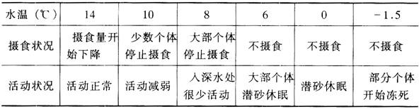 图3-1 三疣梭子蟹的外形 打开头胸甲,可见到内脏中央有一个近五角形的透明微黄的心脏。前后端均有动脉与各器官相连;左右两侧为鳃腔,具6对灰白色的鳃;消化管自口经过一很短的食道与胃囊相通,后面连接一条细的肠道直通腹部末端的肛门。胃的两侧有左右两叶肝脏,土黄色,占据了头胸甲的大部;雌蟹具卵巢1对,当成熟怀卵时,卵巢几乎充满整个头胸甲,一直延伸到侧刺内,为橙黄色,遮盖消化腺的大部。左右卵巢各接一输卵管,其末端有纳精囊,开口于胸板愈合后的第三节。雄性在头胸部前侧缘肝脏表面有1对乳白色回转弯曲的长带状精巢,与螺旋形输精管相连,末端即为射精管,开口于游泳足基部的雄性生殖孔。 三疣梭子蟹在我国分布很广,北起辽东半岛,南至闽南沿海均有分布,尤以黄渤海产量最高。日本、朝鲜、菲律宾、红海等地亦有它的踪迹。 (二)生态习性 1.栖息和运动 三疣梭子蟹喜栖息在潮间带较广阔的内湾水域、河口附近。如我国的莱州湾、渤海湾、吕泗、长江口、闽浙沿海,日本的东京湾、三沙湾、伊势湾、濑户内海、有明海等,以砂、泥底的海区较多见。三疣梭子蟹的活动范围,又随季节、水温而不同。如我国渤海梭子蟹,当春季“五一”节前后即来浅海产卵,尤喜在海湾的河口附近如渤海的辽河口、大清河口、大沽河口、黄河口等地,水深10米以下,多在水深3~5米处。初孵幼体和小蟹常在海边近岸处发现,随着个体的长大,即摄食活动于较深水域。10月中旬以后,水温下降,蟹子则游向更深的水域,至12月上旬,陆续到达渤海中部水深10~30米软泥底质水域蛰伏越冬。据日本大岛信夫观察,濑户内海的三疣梭子蟹在深水区越冬,随着春季水温的上升,从3月中旬开始,雌蟹为产卵而向浅水区移动。抱卵个体多分布在5~15米水深处,藻场内外或干潮线附近也有发现。又据爱知县水产试验场对伊势湾的调查,三疣梭子蟹的产卵群体在5~6月开始从外海向内湾或从内湾深水处向近岸浅水处移动,在水深约10米,底质为砂或泥质的海域内产卵。 三疣梭子蟹白天多潜入泥沙中,潜砂时身体与底面呈15°~45°交角,有时仅露出复眼和触角。潜入不深,无钻深洞能力。夜间游动较为频繁,多在黄昏前即开始起水游动。游动时常将整个身体倒垂在水中,以游泳足紧贴水面旋转摆动,使身体做侧向运动。也常在水层中或贴近水底做不定向的水平游动。 2.对环境的适应 三疣梭子蟹系温热带浅海生活的蟹类,水温自15~32℃皆能生活和生长,据王友松等试验,在水温20~27℃时摄食和生长较旺盛。渤海梭子蟹种群对低温的适应能力较强,据我们在莱州蟹池内养殖情况的观察,当水温14℃左右,摄食量开始下降,当水温8℃时,仍发现个别蟹子摄食,当水温降至-1.5℃才开始冻死。山东莱州养蟹池内,春天曾发现潜砂越冬后幸存的个体(表3-1)。 表3-1 在低温下梭子蟹的活动情况(莱州养蟹池内观察)