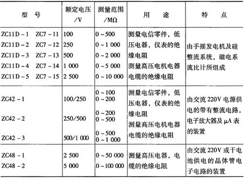 式中:R2——电动机在额定负载下测定的电阻值(Ω); R1——电动机在静止冷态下测定的电阻值(Ω); t2——额定负载时的环境温度(℃); t1——测定R1时的环境温度(℃); K——系数,铜绕组为235,铝绕组228。 9.绝缘电阻 绝缘电阻是反映电动机以及其他电气设备性能好坏的重要依据。 新电机或停用3个月以上的电动机使用前应检查绕组间及绕组对地(外壳)的绝缘电阻。对绕线式转子电动机,还应检查转子绕组及滑环对地(外壳)及滑环之间的绝缘。通常绝缘电阻每1kV工作电压不得小于1MΩ。 通常500V以下电动机用500V兆欧表(也叫摇表)测量,500~3000V电动机用1000V兆欧表测量,3000V以上的电动机用2500V兆欧表测量。一般三相380V电动机的绝缘电阻应大于0.5MΩ方可使用。 表2-7为常见的国产兆欧表数据。 表2-7 常见的国产兆欧表型号及数据