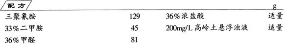 将三聚氰胺、甲醛、二甲胺按配比分别加入三颈烧瓶中,控制一定温度和酸度,搅拌均匀,即为成品。