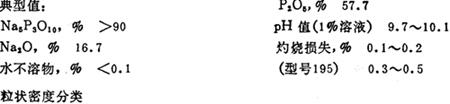 颗粒状的三聚磷酸钠视比重为0.48~0.72。三聚磷酸钠对金属离子有良好的络合能力,与水中的钙、镁、铁等离子络合,生成络合物,使水软化。对固体物质有极强的分散力和悬浮力,配制在洗涤剂中能提高洗涤效力。