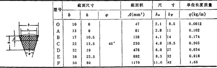 图3-5-40 三角胶带的结构 线绳结构(图3-5-40b)——由伸张层1(胶料)、强力层2(胶线绳)、压缩层3(胶料)和包布层4(胶帆布)组成。 (一)三角胶带规格 根据GB1171-74规定,三角胶带剖面尺寸分为O、A、B、C、D、E、F,7种型号,见表3-5-41。 表3-5-41 三角胶带型号及截面尺寸(按GB1171-74) mm
