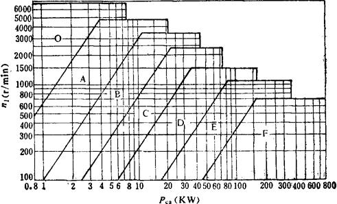 注:在反复起动、正反转频繁、工作条件恶劣等场合,KA值应乘以1.1;增速传动KA值应乘以1.2;当在松边外侧加张紧轮时,KA应乘以1.1。 2.选择带的型号 根据计算功率Pca。和主动轮转速n1,由图3-5-41选定带的型号。