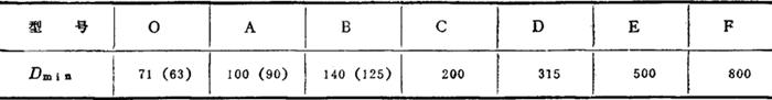 图3-5-41 三角胶带选型图 3.确定带轮计算直径D1、D2: (1)初选主动轮直径D1: 据三角带型号参考表3-5-43选取D1≥Dmin 表3-5-43 三角胶带带轮的最小直径Dmin(mm)