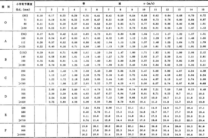 式中 P0——单根胶带所能传递的功率(kW),见表3-5-44 表3-5-44 单根三角胶带所能传递的功率P0(i=1;α1=α2=180°;特定带长;平稳载荷)(kW)