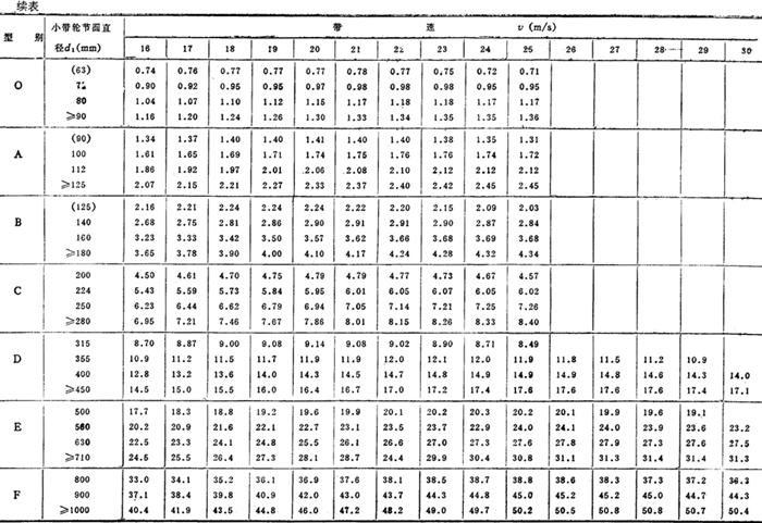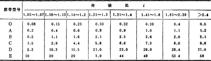 k——材质系数,对于棉帘布和棉线绳结构的胶带,取k=1;对于化学纤维线绳结构的胶带,取k=1.33 ⊿P0——单根胶带传递功率的增量(kW) ⊿P0=0.0001⊿Tn1 ⊿T——单根胶带所能传递的扭矩的修正值(N·m),见表3-5-47 表3-5-47 单根胶带所能传递的扭矩的修正值⊿T(N·m)