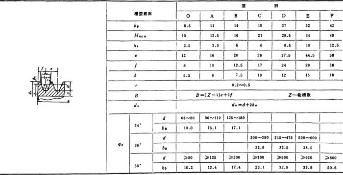 注:(1)尺寸b0的偏差按h12。 (2)槽角φ0的偏差对O、A、B型为±1,C、D、E、F型为±30′。 (3)轮槽工作表面光洁度▽5(d>300mm)或▽6(d≤300mm)。 (4)对于活络三角胶带为使螺钉头不与槽底相碰,H应适当加大, |