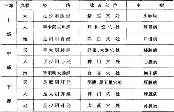 | 释义 | 三部九候脉诊法 《素问·三部九候论篇》曰:“人有三部,部有三候,以决死生,以处百病,以调虚实,而除邪疾”。所谓“三部”即上部(头)、中部(手)、下部(足);“九候”即每部中有天、地、人三候(亦称“三才”)。详见表2-63。 表2-63 三部九候脉诊表*