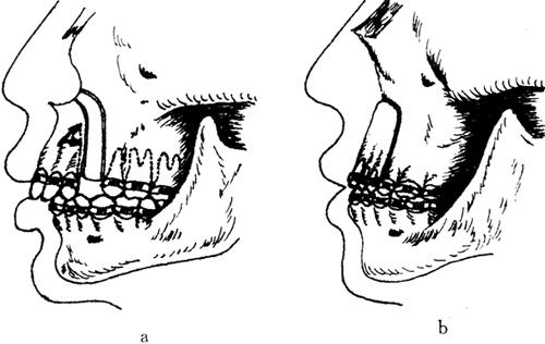 (3)用手指或上颌钳小心断离前颌骨块,使之能随意后退至计划位置,直至理想程度。用术前备妥的牙弓夹板或微型固定夹板,将就位的骨段固定于上颌,继用预制的唇弓丝经牙面锁槽将上牙列整体栓结固定(图16-1)。
