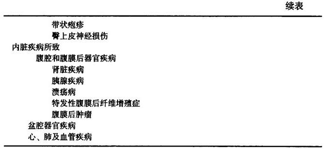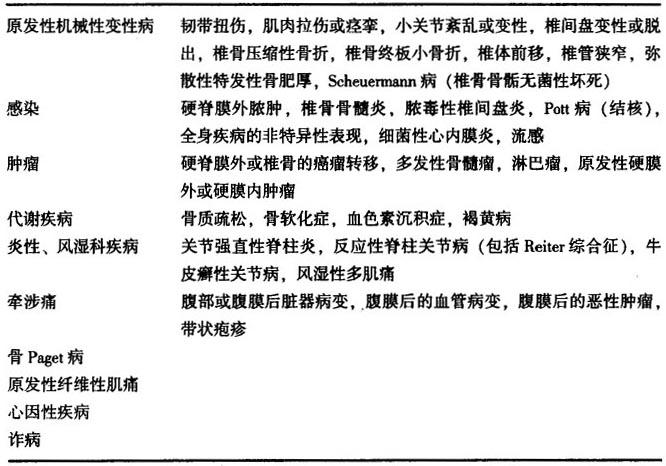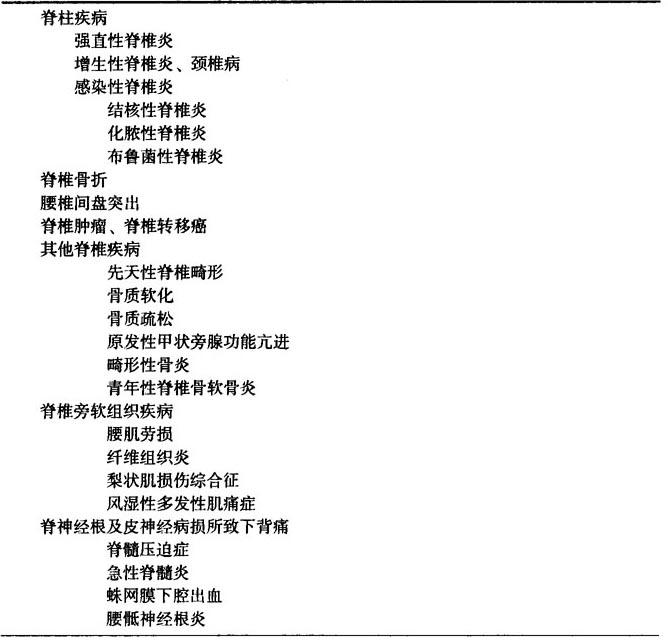 | 释义 | 下背痛的诊断与治疗 下背痛(low back pain) 指的是后背的腰、骶部疼痛或不适感,伴有或不伴有放射性疼痛。下背痛是临床较常见的症状之一,在神经科、内科、外科和妇科的门诊均可见到,但由于症状、体格检查、影像学改变和解剖所见之间无密切的联系,诊断上有一定的难度。90%以上的成年人一生中至少有过一次下背痛。此症状往往呈慢性经过,影响劳动能力比较明显,为就职青壮年病休的重要原因,因此尽管专家们呼吁应选择性地进行外科手术,并强调手术对减轻疼痛的成功率极低,但在美国从1979~1990年,背部手术却增长了55%。下背痛的病因复杂,且表现多样,需根据病史、危险因素及查体等进行高选择性的辅助检查评估。 腰背部的组织,自外向内依次为皮肤、皮下组织、肌肉、韧带、脊柱、肋骨、脊髓膜和脊髓等。上述任何一种组织发生病变时均可引起下背痛。内脏疾病也可引起下背痛,以腰背部邻近器官,如胸膜、肾、胰、直肠、前列腺等病变引起放射性疼痛多见。 一、病因及分类 根据发病的急缓,下背痛可分为急性、亚急性、慢性和复发性。小于7天为急性,7天至7周为亚急性,7周以上为慢性下背痛。又可将其分为单纯性和复杂性下背痛,前者指的是无全身疾病危险因素的症状和体征,病源多为非特异性,常归类于机械性因素;后者在仔细问诊时常可发现全身性疾病的存在,查体有神经根或脊髓受压体征,需要进一步进行实验室和影像学检查。根据解剖部位,可分为脊柱疾病所致的下背痛、脊椎旁软组织疾病所致的下背痛、脊神经根受刺激所致的下背痛和内脏疾病所致的下背痛。下背痛的病因复杂,大致可归结为:①机械性(结构性):如肌肉韧带损伤、椎间盘脱出、椎关节退行变、椎管狭窄、脊柱畸形、椎体前移、Scheuermann骨关节炎、骨折、蛛网膜炎和神经根鞘纤维化等;②炎症性 血清反应阴性关节病(椎关节病、关节强直性脊椎炎、牛皮癣性关节炎、Reiter综合征、炎症性肠病性关节炎)和类风湿性关节炎;③感染 包括脓毒血症(椎间盘炎、骶髂关节炎、椎骨骨髓炎、腰大肌脓肿)、结核(Pott病)、真菌感染和病毒感染(带状疱疹);④肿瘤 原发性和转移性肿瘤;⑤代谢性 骨质疏松、软骨钙化、褐黄病和变形性骨炎等;⑥牵涉痛 根据解剖部位,可分为脊柱疾病所致的下背痛,脊椎旁软组织疾病所致的下背痛,脊神经根受刺激所致的下背痛,内脏疾病所致的下背痛。腰背痛疾病的分类见表10-1和表10-2。 表10-1 腰背痛疾病的分类