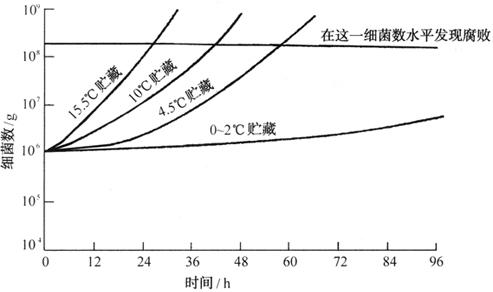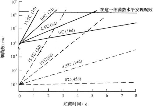 图1-7-10 初始嗜冷菌数为106个/g的牛肉饼在不同温度下的贮藏期 图1-7-11所示为细菌数(100~1×106个)对法兰克福肠低温下贮藏期的影响,贮藏温度与图1-7-6相同,均为0℃、4.5℃、10℃和15.5℃。当产品表面的细菌数达到1.5×108个/cm2时出现黏液,表明产品开始腐败。产品污染较轻时(菌数较少)可以明显延长产品的贮藏期,尤其是当贮藏温度低于5℃时更是如此。由以上各图可知,为保证产品安全合理的贮藏期,采取低温贮藏和降低产品初始菌数的重要意义无论如何强调都是不过分的。