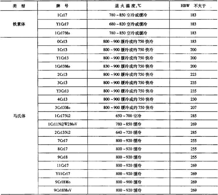 表5-69 铁素体钢和马氏体钢退火工艺及硬度