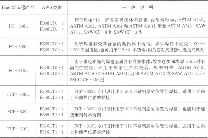 | 释义 | 不锈钢药芯焊丝生产厂商举例 林肯公司推出的不锈钢药芯焊丝,如Lincoln Electric’s Blue Max气保护药芯焊丝为焊接不锈钢的优质焊丝。其特点是容易操作、低飞溅、去渣容易和成型美观。Blue Max FC焊丝可用于向下焊和横焊,而Blue Max FCP则可用于全位置焊,特别是向上立焊和仰焊。见表3.4-1。 表3.4-1 林肯公司的不锈钢药芯焊丝