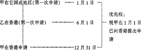由于《巴黎公约》适用于香港,因而香港在专利申请上也实行优先权原则。即申请人就一项发明第一次在某一《巴黎公约》成员国提出正式申请后,可以在此后1年内向所有其他成员国提出同一申请,而第一次申请的日期则为以后所有申请的日期。也就是说,这一申请人有1年的时间可以优先确立在各成员国的专利权。具体到香港,则可图示如下: