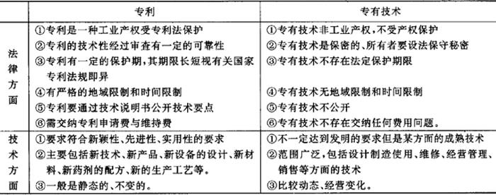 | 释义 | 专有技术与专利的区别与联系 专有技术(know-how)的意思是知道如何做某事的技能(Faculty of kowing how to do something)。在国际技术转让交易中,专有技术可以单独作为标的,也常与专利结合在一起。据不完全统计,附有专有技术的专利许可协议占整个许可贸易的60%,单纯的专有技术转让协议约占30%,而单纯的专利许可协议比重很小。专有技术的地位,在某些方面已经超过了专利。 专有技术与专利都是人们精神创作活动的成果,都属于知识产权的范畴,都具有技术价值和财产价值,成为国际技术转让的主要交易对象。但是,两者又有区别。在技术转让实务中,必须明确专有技术与专利的区别。二者的区别可用下表概括: 专有技术与专利既有区别又有密切的联系。 1.专有技术与专利都是人类创造性思维活动的结果,都是非物质形态的知识。 2.专有技术与专利技术通常共处于实施一项技术所需的知识总体之中,即实施一项技术仅有专利技术是不能完全实施的,必须同时具有专有技术,才能使一项技术得以顺利实施。 3.在技术贸易中,一项技术转让合同往往同时包括专有技术与专利技术许可两项内容,它们相互依存,共同完成技术转让交易。 专利与专有技术的区别