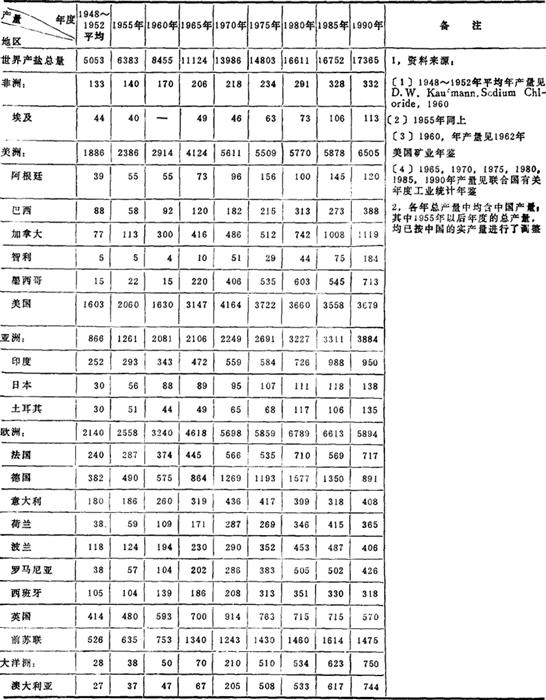 | 释义 | 世界制盐工业 世界制盐工业近30多年来也有很大发展,总产量增加两倍多;其中以澳大利亚、墨西哥、加拿大增长最快,1987年产盐量与1948~1952年平均年产盐量比较,澳大利亚增长21.8倍,墨西哥增长近39倍,加拿大增长近12倍。1985年以来,产盐1000万吨以上的国家,有美国、苏联、中国、德国、加拿大和印度;产盐100万吨以上的国家共21个。世界各大洲和主要产盐国产量增长情况见表1-2-3。 表1-2-3 世界各大洲主要产盐国家年产量 单位:万吨