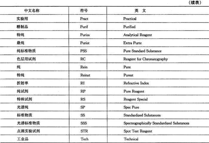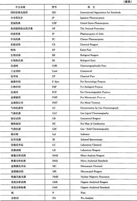 | 释义 | 世界各国化学试剂质量标准 世界各国的化学试剂标准很多,只有国际标准化组织(ISO,International Organization for Standardization-Reagent Standards)化学试剂标准、美国化学会化学试剂标准(ACS,Reagent Chemicals,Amrican Chemical Society Specifications)、英国BDH化学试剂标准(British Drug Houses,AnalaR Standards)、德国的E.Merck化学试剂标准(Emanuel Merck Standard)被我国采用,现简介如下: (一)ISO标准 ISO是国际标准化组织的简称,这个组织的第47技术委员会于1968年10月在柏林召开第八次代表大会时,决定建立“化学分析试剂”工作组,委托这个工作组制订化学试剂规格标准和试验方法标准。1972年在伦敦召开的第47技术委员会第3分委员会第一次会议上,建立由比利时、法国、德国、意大利和英国各派一个代表组成制订化学试剂标准工作小组。1976年3月,工作小组在柏林会议上提出第3分委员会第35号标准文件,其中提出了40种化学试剂国际标准(草案)。ISO于1983-1987年先后颁布两批共97个化学试剂产品标准(ISO635312-1982,ISO6353-3-1987),我国从1988年起逐年安排采用至今,已采用并转成我国标准的共62个(1995年止)。 (二)ACS标准 这是美国化学会标准,是由美国化学会分析试剂委员会提出的,它早期的文本是在1917年出版的。ACS标准现在的格式是1924-1925年形成的,1950年始成为《ACS标准》。1968年出了第4版,1974年出了第5版,1981年出了第6版,1986年出了第7版,一般约5年出版一次,约有384个通用化学试剂标准。 (三)AnalaR标准 AnalaR标准是BDH公司的化学试剂标准,这个公司建立于1908年,当时化学所(Institute of Chemistry)和国家分析工作者学会(The Society of Public Analysts)于1915年出版了分析试剂清单List of Reagent for Analytical Purposes,此清单是以上团体委托一个14人委员会提出的。此委员会包括化学所所长Raphael Meldola及William Tilden和Charles Alexander Hill,此人曾任BDH公司多年的总裁及董事经理。后来凡通过清单所载方法测试的试剂就可贴上“AR”标签,成为名牌产品,这个测试方法和标准被第8次国际应用化学会议的委员会决定采用。Hopkin & William公司的Edmond White于1911年出版了分析试剂Analytical Reagents(共88个试剂),此人1978年加入BDH公司。1925年BDH拟请化学及国家分析工作者学会两团体修定‘AR’标准,但因战争原因未成。故BDH公司就自己修定了‘AR’标准,于1926年1月出版了BDH的AR Standard158个试剂标准,1925年Hopkin & William公司也修订了它的分析试剂一书,共143个试剂标准,1978年此公司已加入BDH公司。后来BDH及Hopkin & William公司均感到在英国需要一个统一的试剂标准。因此1933-1934年初两公司化学家合作于1934年出版了AR标准AnalaR Standards,这就是AnalaR标准,后来出版了6版,到1984年出到第8版,增加70个新标准。 (四)E.Merck标准 这是伊默克(E.Merck)公司的标准,这个公司建立于1827年,该公司很重视质量,在1881年该公司创始人E.Merck就提出生产保证质量的试剂,其传统保持至今。于1888年就出版该公司化学家克劳赫(Krauch)博士的《化学试剂纯度检验》一书,此书附有130多个《伊默克公司保证试剂》表。到1939年此书进行5次修订出版,这是世界上最早的化学试剂标准。于1971年,伊默克公司出版了《伊默克标准》(E.Merch Standards),标准约570多种。现在的E.Merck标准,就是该公司产品目录,每两年出版一次。 世界上不同国家,不同厂习惯于采用各自不同的规格等级。因而也用不同的符号代表。现将常见的试剂及药品的规格和标准所用的符号及其英文原意列于表1-9: 表1-9 世界常见试剂药品规格符号表