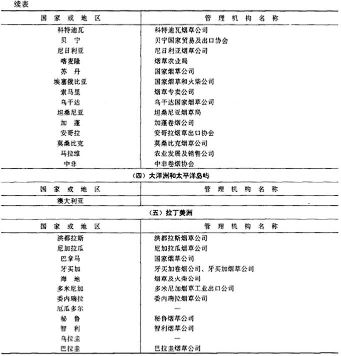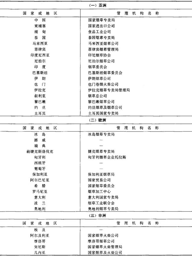 | 释义 | 世界各国烟草专卖简况 (一)世界上实行烟草专卖制度的国家 1992年,世界上共有70多个国家以立法等形式依法对烟草行业实行专卖管理,严格控制这种高税利的特殊消费品,防止税金的流失,增加国家的财政收入。 1990年世界上实行专卖管理制度的国家所生产的卷烟约占当年世界卷烟总产量的61%。世界上实行烟草专卖制度的国家(地区)详见表2-3-4。 表2-3-4 世界上实行烟草专卖的国家(地区)