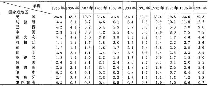 | 释义 | 世界白肋烟主产国家和产量 1992年世界白肋烟产量,美国占世界总产量的32.92%,其次是马拉维、巴西和中国等国家。世界白肋烟主要生产国白肋烟产量,见表4-2-1。 表4-2-1 世界白肋烟主要生产国白肋烟产量 单位:万t