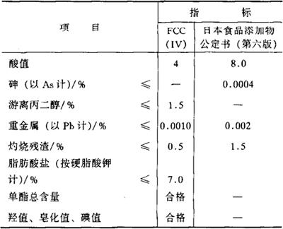 鉴别方法 (1)取本品0.1g,加乙醇2mL,加温溶解,加硫酸5mL(1+2),在水浴中加热30min后,冷却时产生油滴式白色至黄色固体。分离此油滴或固体,加入乙醚3mL,摇混时油滴或固体溶解。 (2)取本品5g,加氢氧化钾乙醇溶液50mL,装上回流冷凝器。在水浴上加热1h,蒸馏去乙醇至呈干涸状为止。然后加盐酸50mL(1+30)充分摇混,将生成的脂肪酸用石油醚、丁酮(7∶1)混合液,每次40mL,萃取分离3次,充分搅拌水层,滴加氢氧化钠溶液(1+25),调至约中性后,在水浴中减压浓缩,加入40℃的甲醇20mL,摇混,冷却过滤,在水浴中蒸馏去滤液中的甲醇,得粘性物。将该粘性物的甲醇溶液(1+9)作为检测液。取检测液,将甲醇、丙二醇混合液(9∶1)及甲醇、甘油混合液(9∶1)作为对照液,用正丁醇、甲醇、氯仿混合液(5∶3∶2)作为展开剂,进行薄层色谱分析。薄层板用硅胶,在110℃干燥1h,作为载体。展开溶剂的前沿由原线升高到15cm高度时,即停止展开,风干,在110℃加热10min,除去溶剂,冷却后用百里酚蓝、硫酸试液喷雾,在110℃加热20min使显色。结果看到,有与对照液丙二醇相同位置上的黄色斑点,及与对照液甘油相同位置的白色斑点。 毒理学依据 1.LD50 大鼠口服大于10g/kg(bw)。 2.GRAS FDA-21CFR 172.856及172862,172866,173340。 3.ADI 0~25g/kg(bw)(FAO/WHO,1994)。 使用 乳化剂、消泡剂。 1.使用注意事项 丙二醇脂肪酸酯的乳化性能较其他乳化剂稍差,一般不单独使用,而多与其他乳化剂合用,起协同效应。与其他乳化剂相比,因熔点、溶解性、粘度不同,使用条件、目的不同,特别利用其结晶性,能防止β-晶形转变。 2.使用范围及使用量 (1)我国《食品添加剂使用卫生标准》(GB 2760-1996)规定:可用于糕点,最大用量为2.0g/kg。用于复合调味料,最大用量20g/kg。 (2)实际使用参考: ①用于糕点、起酥油制品,能提高保湿性,增大比体积,具有保持质地柔软,改善口感等特性。 ②用于人造奶油,可防止油水分离,并有上述糕点中的效果。 |