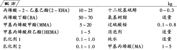 在装有搅拌器、冷凝管、温度计和滴液漏斗的四颈烧瓶中,按配比将全部物料投入,进行乳化聚合反应。聚合温度80~85℃,反应时间5~8h。经测试固体含量、pH值和黏度合格后,即为产品。