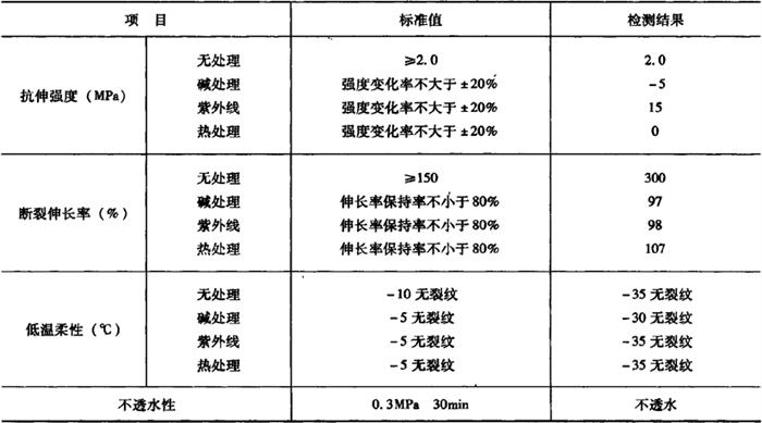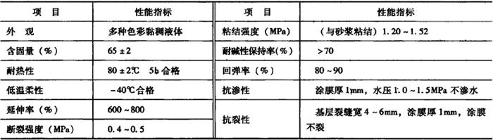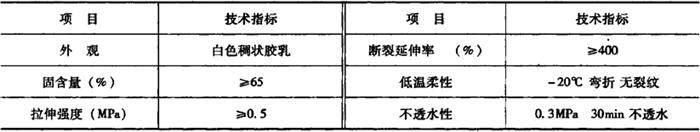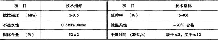 (六)BR-40弹性涂膜防水剂 1.BR-40弹性涂膜防水剂的特点 BR-40弹性涂膜防水剂,系以含量在40%以上的纯丙烯酸酯聚合乳液,通过加入适量的改性剂、交联剂等助剂,经精心制作而成。 BR-40弹性涂膜防水剂的防水效果比普通乳液有显着提高,产品无毒、无味、无污染,可在封闭的环境下施工,对作业人员毫无毒害;其具有优异的弹性,涂膜断裂伸长率可达200%~400%,足以抵抗基面产生的裂缝;低温柔性好,适应性很强,可以在全国各地区使用,而且还具有优良的耐候性、抗紫外线性能及耐磨性,也可以直接在潮湿的基面上施工。 2.BR-40弹性涂膜防水剂的适用场合 BR-40弹性涂膜防水剂适用于屋面、厕浴间、地下室底板及墙体的整体防水,尤其适用于异型、复杂部位的防水工程。BR-40弹性涂膜防水剂的技术性能见表10-76。 表10-76 BR-40弹性涂膜防水剂的技术性能