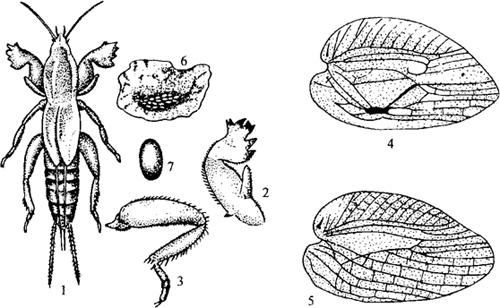 | 释义 | 东方蝼蛄 【学名】 Gryllotalpa orientalis Burmeisler 【别名】 小蝼蛄、土狗子、拉拉蛄。 【分布与为害】 是世界性害虫。中国各地都有分布,但以南方受害较重。食性杂。为害多种花木、幼根、根茎,切口常参差不齐,甚至有纤维粘连。尤其是一、二年生草本及扦插苗,被咬幼苗,常枯萎而死。蝼蛄在土表层来回串行,造成纵横隧道,使苗根部与土层脱离,失水枯干而死。 【形态特征】 成虫体长30~50毫米。前胸宽6~8毫米,淡黄褐色。腹部近纺锤形。全体密被细毛。头部圆锥形。触角丝状。前胸背板呈卵圆形,中央有1凹陷,暗红色斑明显,斑长4~5毫米。前翅短,仅达腹部中部,后翅长,超过腹部末端。雄性前翅后缘中部,靠里区域上Cu2脉,呈角状弯曲,并与A脉愈合组成粗大坚硬的音挫。雌性前翅Cu2弯曲度较缓,折角状不明显,且无愈合A脉的现象。前足特化为开掘足,后足胫节背侧有刺3~4根,腹末具1对尾须(图5-46)。卵椭圆形,长2.8毫米,初产时乳白色,渐变黄褐色,孵化前暗紫色。初孵若虫乳白色,腹部漆红色或棕色,半天后变成灰褐色,似成虫。复眼淡红色,无翅或仅有翅芽。
